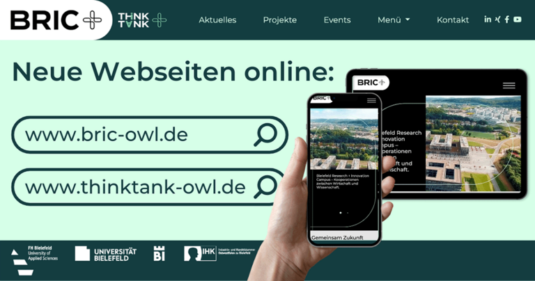 “Wir machen Forschungs- und Transferarbeit am Hochschulcampus Bielefeld verständlich und lebendig sichtbar.” – mit diesem Ziel wurden für den Bielefeld Research + Innovation Campus (BRIC) sowie das Projekt ThinkTank OWL zwei neue Webseiten entwickelt.